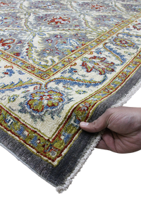 Discover the elegance of our luxury traditional Chobi rug, meticulously handmade using time-honored techniques passed down through generations. This exquisite rug is crafted from 100% premium wool, offering superior softness, durability, and natural warmth. The Chobi design is celebrated for its intricate patterns and harmonious color palette, featuring soothing shades of green and gray that are naturally derived from vegetable dyes. These eco-friendly dyes not only create rich, long-lasting colors but also honor sustainable craftsmanship. Each knot is tied by skilled artisans, ensuring that every detail reflects traditional artistry and cultural heritage. This rug is a perfect blend of authenticity and, destined to elevate any living space with its timeless beauty and exceptional quality. Invest in a piece that carries the legacy of handmade excellence and natural materials, making your home both stylish and environmentally conscious.