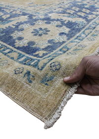 Discover the elegance of our luxury traditional Chobi rug, meticulously handmade using time-honored techniques passed down through generations. This exquisite rug is crafted from 100% premium wool, offering superior softness, durability, and natural warmth. The Chobi design is celebrated for its intricate patterns and harmonious color palette, featuring soothing shades of green and gray that are naturally derived from vegetable dyes. These eco-friendly dyes not only create rich, long-lasting colors but also honor sustainable craftsmanship. Each knot is tied by skilled artisans, ensuring that every detail reflects traditional artistry and cultural heritage. This rug is a perfect blend of authenticity and, destined to elevate any living space with its timeless beauty and exceptional quality. Invest in a piece that carries the legacy of handmade excellence and natural materials, making your home both stylish and environmentally conscious.