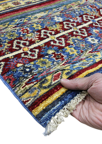 Experience the unique charm of a Khorjin rug, traditionally handmade by skilled artisans in the tribal regions of Iran and Central Asia. Originally crafted as a functional bag for carrying goods, Khorjin rugs are renowned for their bold, geometric patterns and vibrant colors, reflecting the rich cultural heritage of nomadic weavers. Each rug is woven using high-quality wool with meticulous hand-knotting techniques that ensure durability and intricate design. What makes Khorjin rugs special is their authentic tribal artistry combined with practical origins, offering a distinctive blend of rustic beauty and cultural significance. Perfect for adding a touch of history and warmth to any space, a genuine Khorjin rug is a cherished piece of nomadic tradition.