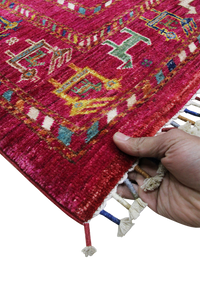 Experience the unique charm of a Khorjin rug, traditionally handmade by skilled artisans in the tribal regions of Iran and Central Asia. Originally crafted as a functional bag for carrying goods, Khorjin rugs are renowned for their bold, geometric patterns and vibrant colors, reflecting the rich cultural heritage of nomadic weavers. Each rug is woven using high-quality wool with meticulous hand-knotting techniques that ensure durability and intricate design. What makes Khorjin rugs special is their authentic tribal artistry combined with practical origins, offering a distinctive blend of rustic beauty and cultural significance. Perfect for adding a touch of history and warmth to any space, a genuine Khorjin rug is a cherished piece of nomadic tradition.