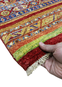 Experience the unique charm of a Khorjin rug, traditionally handmade by skilled artisans in the tribal regions of Iran and Central Asia. Originally crafted as a functional bag for carrying goods, Khorjin rugs are renowned for their bold, geometric patterns and vibrant colors, reflecting the rich cultural heritage of nomadic weavers. Each rug is woven using high-quality wool with meticulous hand-knotting techniques that ensure durability and intricate design. What makes Khorjin rugs special is their authentic tribal artistry combined with practical origins, offering a distinctive blend of rustic beauty and cultural significance. Perfect for adding a touch of history and warmth to any space, a genuine Khorjin rug is a cherished piece of nomadic tradition.