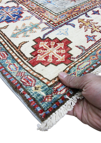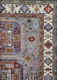 Discover the exquisite charm of our Super Kazak rug, a masterpiece handmade by skilled artisans in the Caucasus region in what is now today Armenia and Azerbaijan. Traditionally crafted using time-honored weaving techniques, each rug showcases bold geometric patterns and vibrant colors, characteristic of Kazak heritage. Woven from high-quality wool, the Super Kazak rug offers exceptional durability and a plush texture that stands out from other rugs. Its unique combination of striking design, rich symbolism, and superior craftsmanship makes it a distinguished piece that adds character and warmth to any interior. Embrace the cultural legacy and timeless beauty of a genuine Super Kazak rug, perfect for those who appreciate authentic artistry.