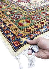 Discover the exquisite charm of our Super Kazak rug, a masterpiece handmade by skilled artisans in the Caucasus region in what is now today Armenia and Azerbaijan. Traditionally crafted using time-honored weaving techniques, each rug showcases bold geometric patterns and vibrant colors, characteristic of Kazak heritage. Woven from high-quality wool, the Super Kazak rug offers exceptional durability and a plush texture that stands out from other rugs. Its unique combination of striking design, rich symbolism, and superior craftsmanship makes it a distinguished piece that adds character and warmth to any interior. Embrace the cultural legacy and timeless beauty of a genuine Super Kazak rug, perfect for those who appreciate authentic artistry.