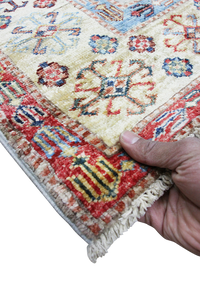 Discover the exquisite charm of our Super Kazak rug, a masterpiece handmade by skilled artisans in the Caucasus region in what is now today Armenia and Azerbaijan. Traditionally crafted using time-honored weaving techniques, each rug showcases bold geometric patterns and vibrant colors, characteristic of Kazak heritage. Woven from high-quality wool, the Super Kazak rug offers exceptional durability and a plush texture that stands out from other rugs. Its unique combination of striking design, rich symbolism, and superior craftsmanship makes it a distinguished piece that adds character and warmth to any interior. Embrace the cultural legacy and timeless beauty of a genuine Super Kazak rug, perfect for those who appreciate authentic artistry.