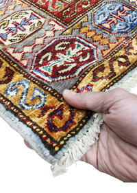 Discover the exquisite charm of our Super Kazak rug, a masterpiece handmade by skilled artisans in the Caucasus region in what is now today Armenia and Azerbaijan. Traditionally crafted using time-honored weaving techniques, each rug showcases bold geometric patterns and vibrant colors, characteristic of Kazak heritage. Woven from high-quality wool, the Super Kazak rug offers exceptional durability and a plush texture that stands out from other rugs. Its unique combination of striking design, rich symbolism, and superior craftsmanship makes it a distinguished piece that adds character and warmth to any interior. Embrace the cultural legacy and timeless beauty of a genuine Super Kazak rug, perfect for those who appreciate authentic artistry.