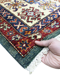 Discover the exquisite charm of our Super Kazak rug, a masterpiece handmade by skilled artisans in the Caucasus region in what is now today Armenia and Azerbaijan. Traditionally crafted using time-honored weaving techniques, each rug showcases bold geometric patterns and vibrant colors, characteristic of Kazak heritage. Woven from high-quality wool, the Super Kazak rug offers exceptional durability and a plush texture that stands out from other rugs. Its unique combination of striking design, rich symbolism, and superior craftsmanship makes it a distinguished piece that adds character and warmth to any interior. Embrace the cultural legacy and timeless beauty of a genuine Super Kazak rug, perfect for those who appreciate authentic artistry.